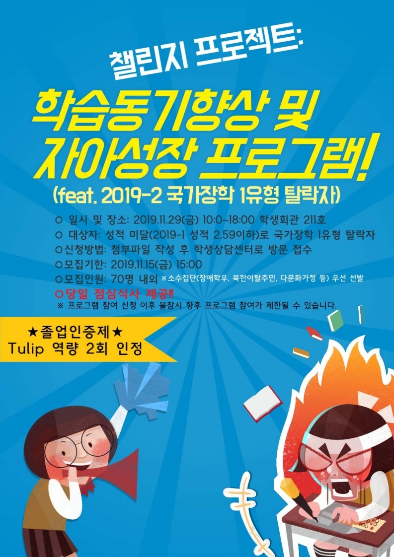 2019학년도 2학기 국가장학 1유형 탈락자 대상 챌린지 프로젝트: 학습동기향상 및 자아성장 프로그램 참여 안내