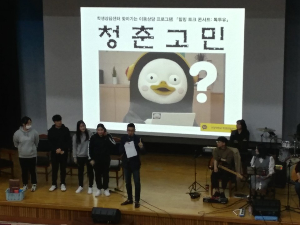 2019년 11월 12일(화) 17:00~20:00 학생상담센터에서 개최한 스트레스 관리를 위한 찾아가는 이동상담 Ⅱ: 힐링 토크 콘서트 톡투유에 총 209명의 학생이 참여하였습니다.