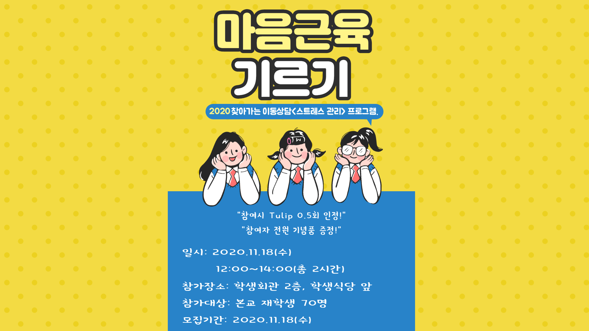 학생상담센터에서는 여러분에게 직접 찾아가는 이동상담<스트레스 관리> 프로그램을 준비했습니다.