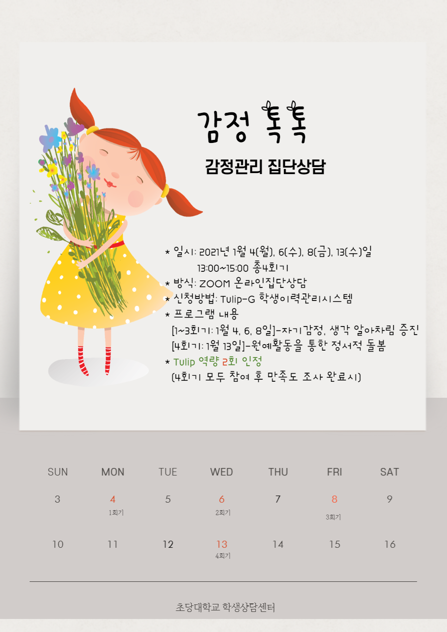방학동안에도 알차고 건강한 생활을 위해 감정관리 집단상담을 진행하고자 하오니 많은 관심과 참여 바랍니다.