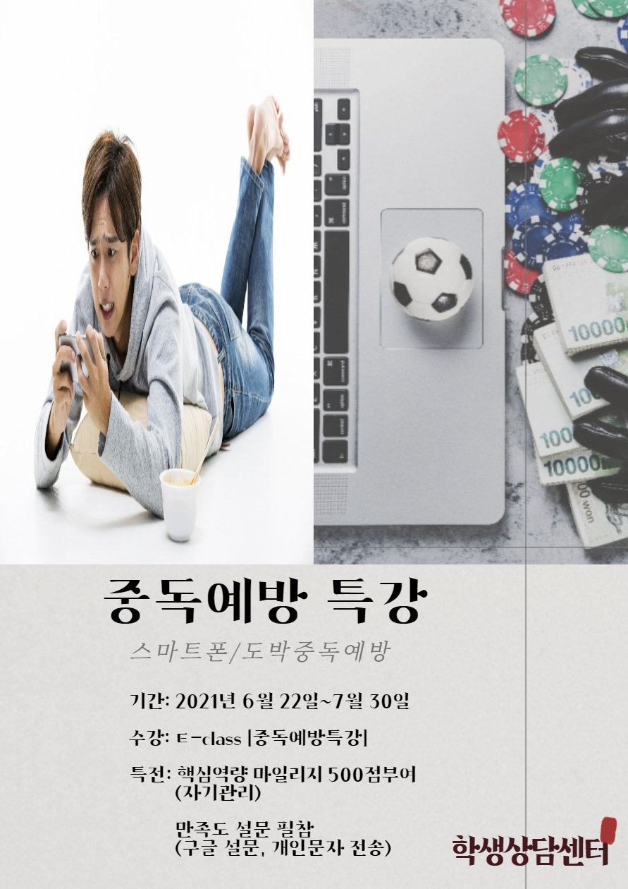 학생상담센터에서 나의 스마트폰 사용습관을 점검하고 바르게 사용하는 방법을 알려드리기 위해 스마트폰 중독예방 특강을 준비했습니다. 그리고 나도 모르게 빠져 들기 쉬운 도박문제 영화 '미로', 개그맨 김기리의 영화 후기 '도박문제 예방교실'영상을 준비했습니다.