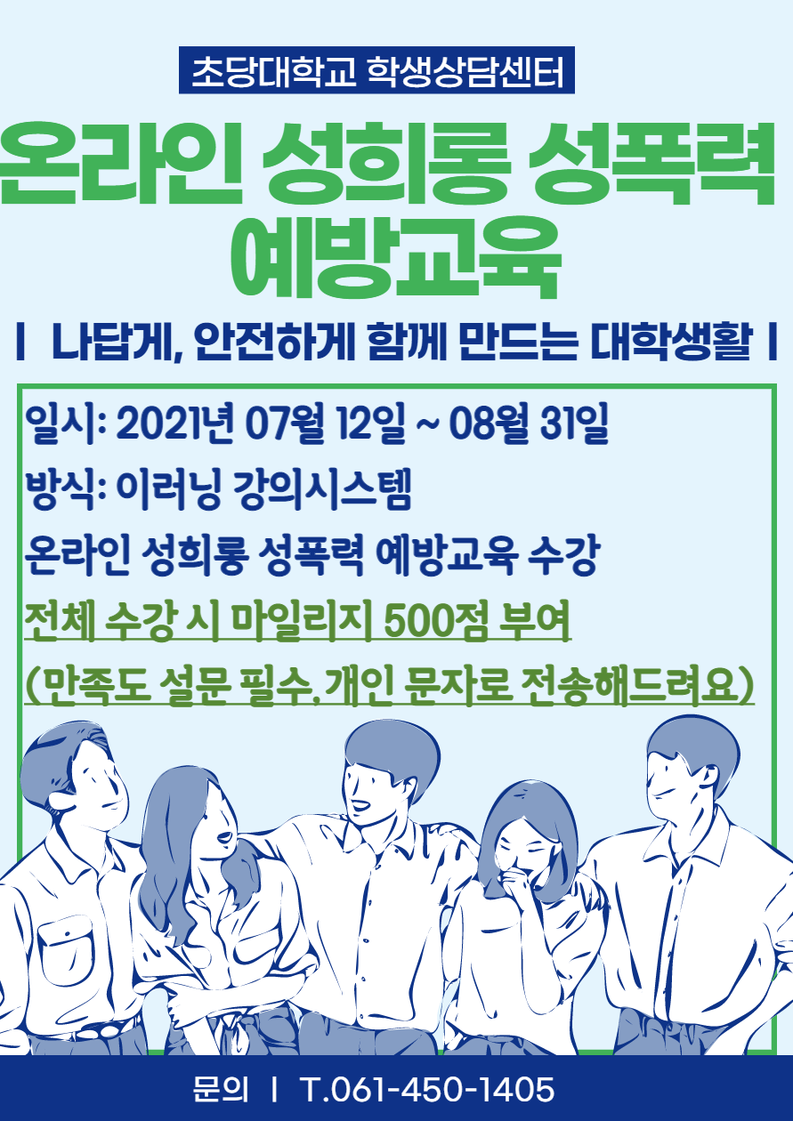 재학생 여러분들의 안전한 대학생활을 위해 학생상담센터에서 성희롱 성폭력 예방교육을 실시합니다.
