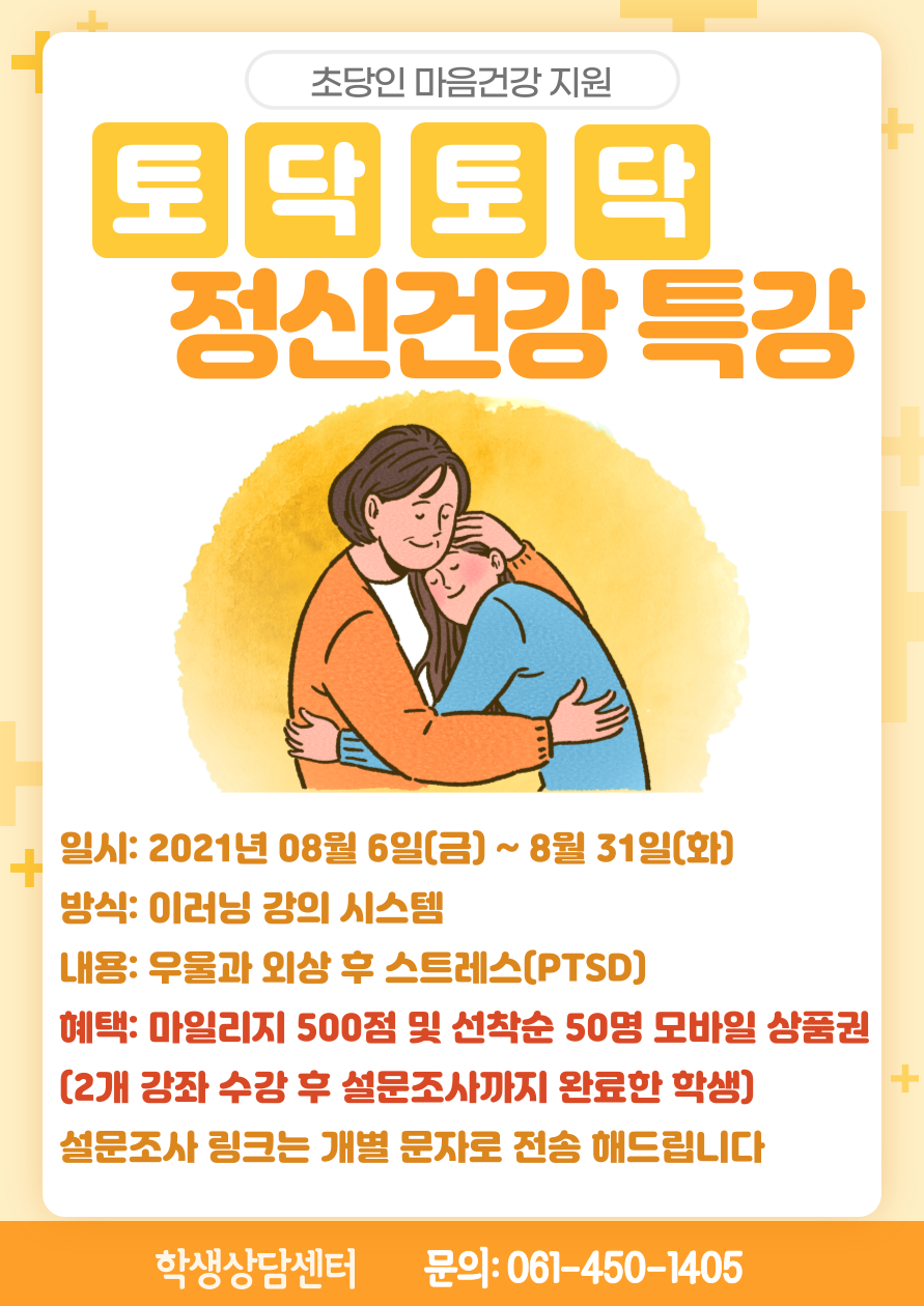 스스로 토닥토닥 점검하고 관리방법을 찾아볼 수 있도록 '정신건강 특강'을 준비했습니다.